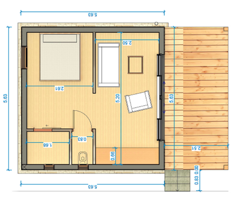 L’Eco-Lodge 20 est conçu dans le pur esprit Lodge avec son format carré et sa terrasse spacieuse. Il offre de multiples possibilités d’aménagement.